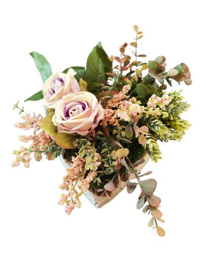 Coeur en pierre de Roses mauves et de plantes grasses