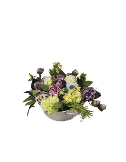 Coupe blanche de pivoines mauves et vertes