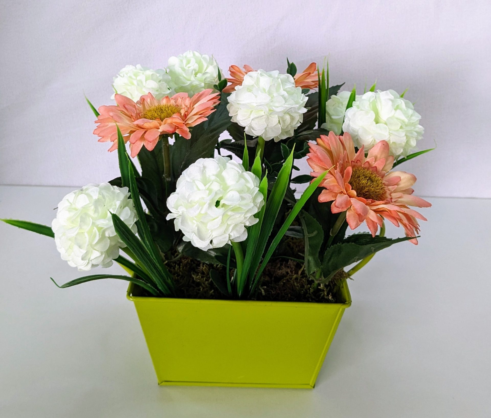 Jardinière de Marguerites saumon et de chrysanthèmes blancs