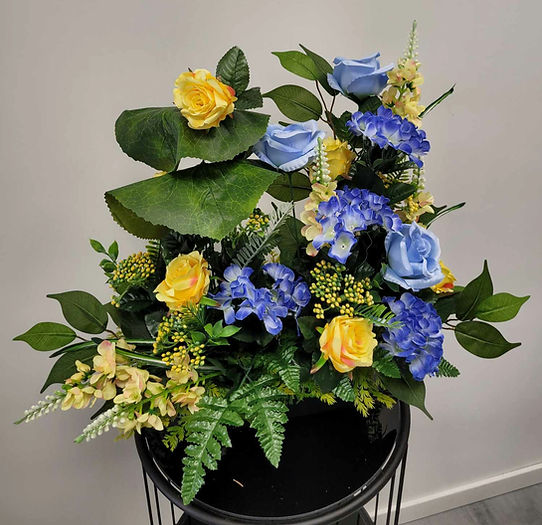 Jardinière de Roses jaunes et d’Hortensias bleus