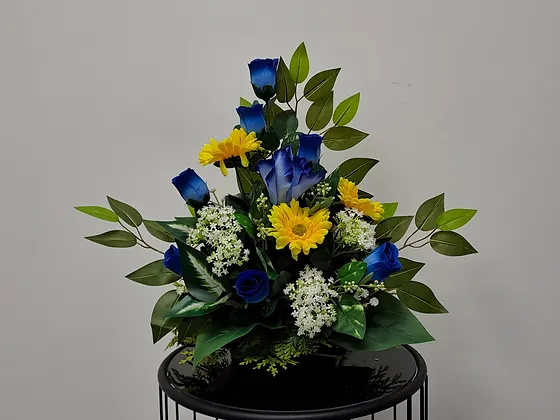 Plateau de Roses bleues et de fleurs jaunes