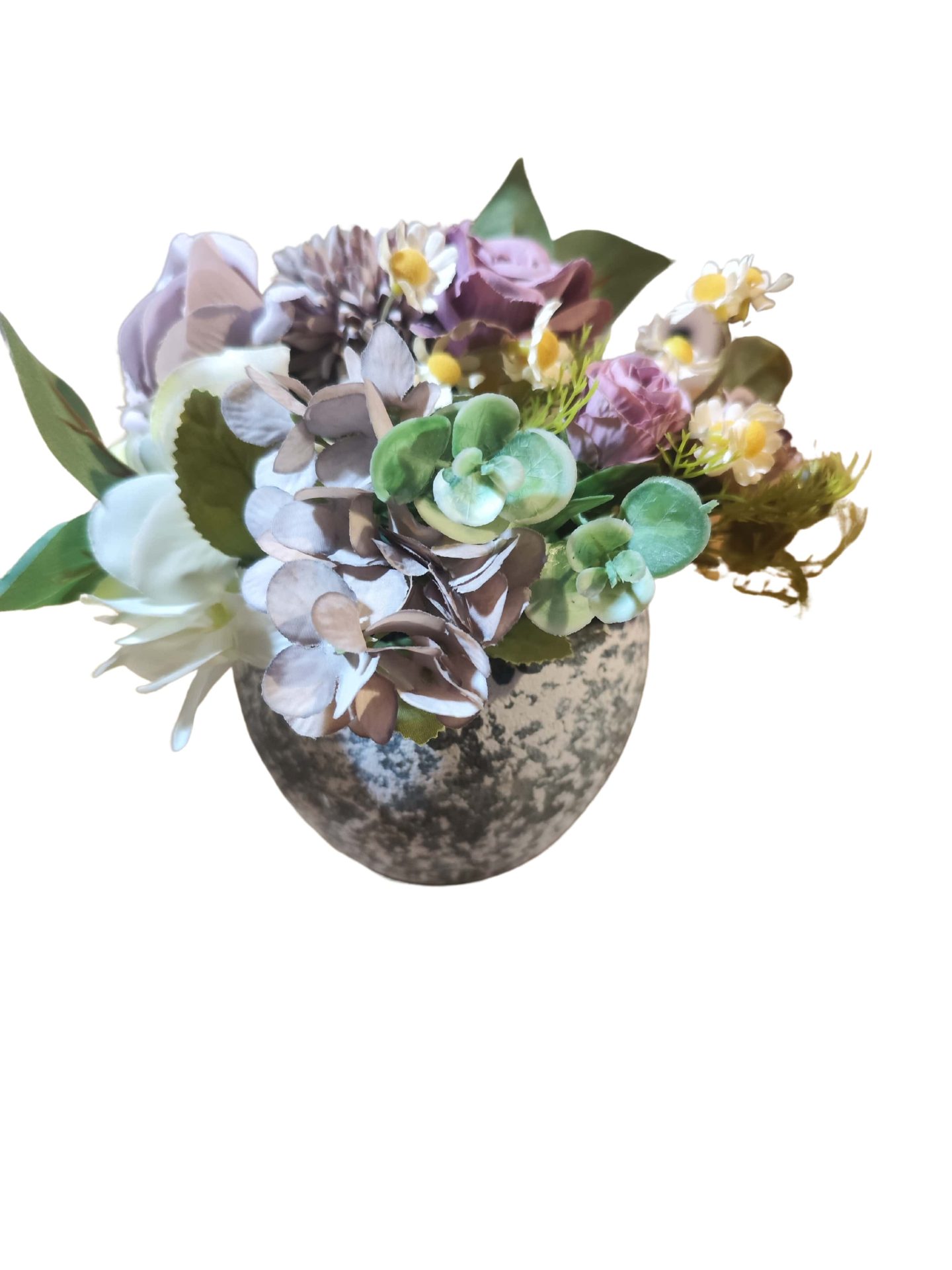 Pot rond de fleurs mauves et crèmes